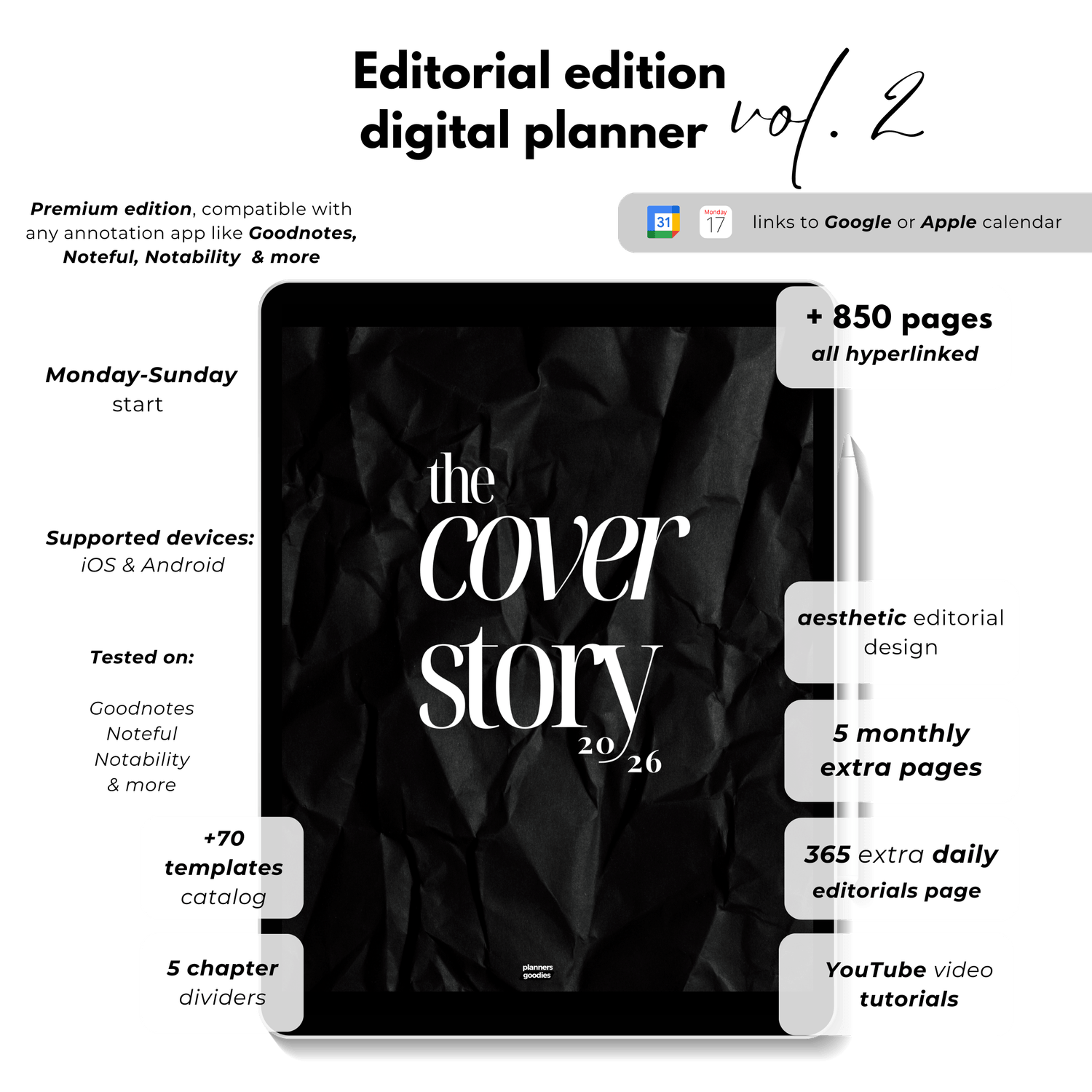 All trademarks, logos, and copyrights related to iPad, Goodnotes, Notability, Noteshelf, Noteful, Xodo, Penly, and other brands mentioned are the property of their respective owners. PlannersGoodies is an independent creator and is not affiliated with, endorsed by, or sponsored by any of these brands or companies.