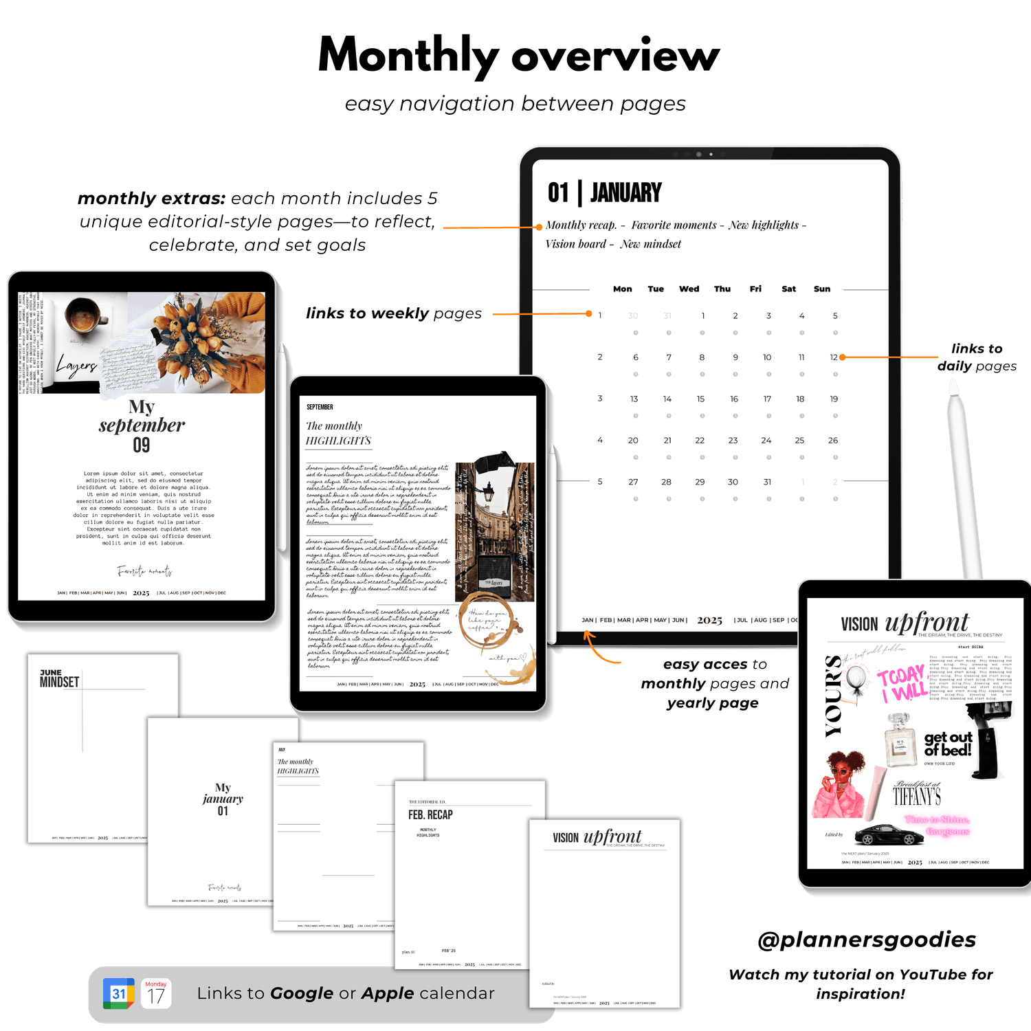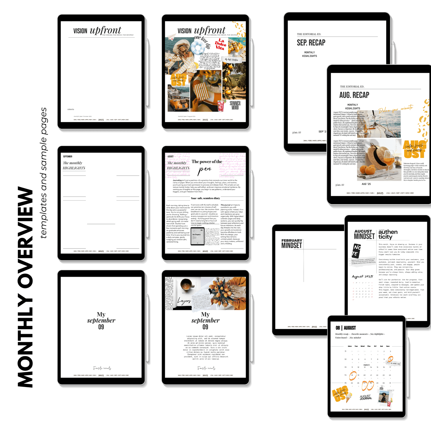 โ๏ธ Monthly Extras: Each month includes 5 unique editorial-style pagesโRecap, Highlights, Favorite Moments, Mindset Journal, and Vision Boardโto reflect, celebrate, and set goals.