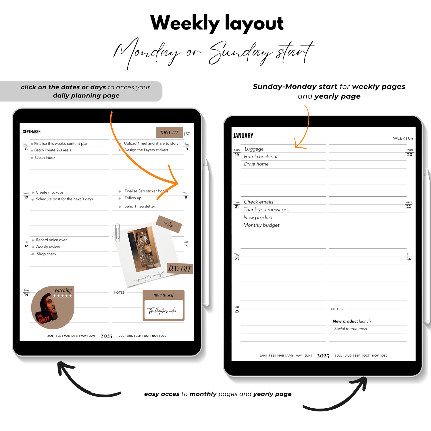 โ๏ธ Monday & Sunday Start Options: Choose your preferred planning style without compromise (for yearly pages, monthly pages, and weekly pages)