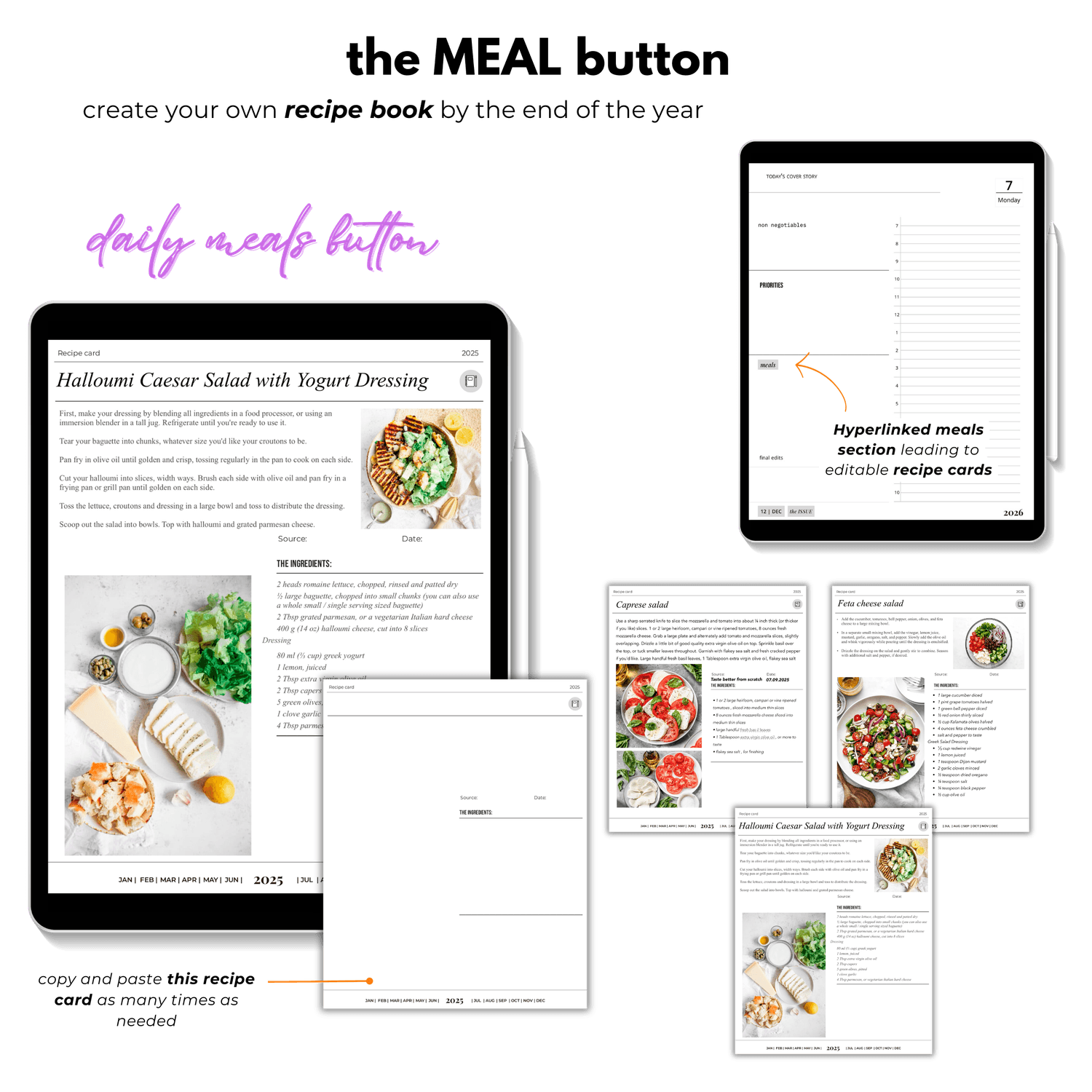 Hyperlinked meals section leading to editable recipe cards (copy-paste as many times as needed and create your recipe book throughout the year)