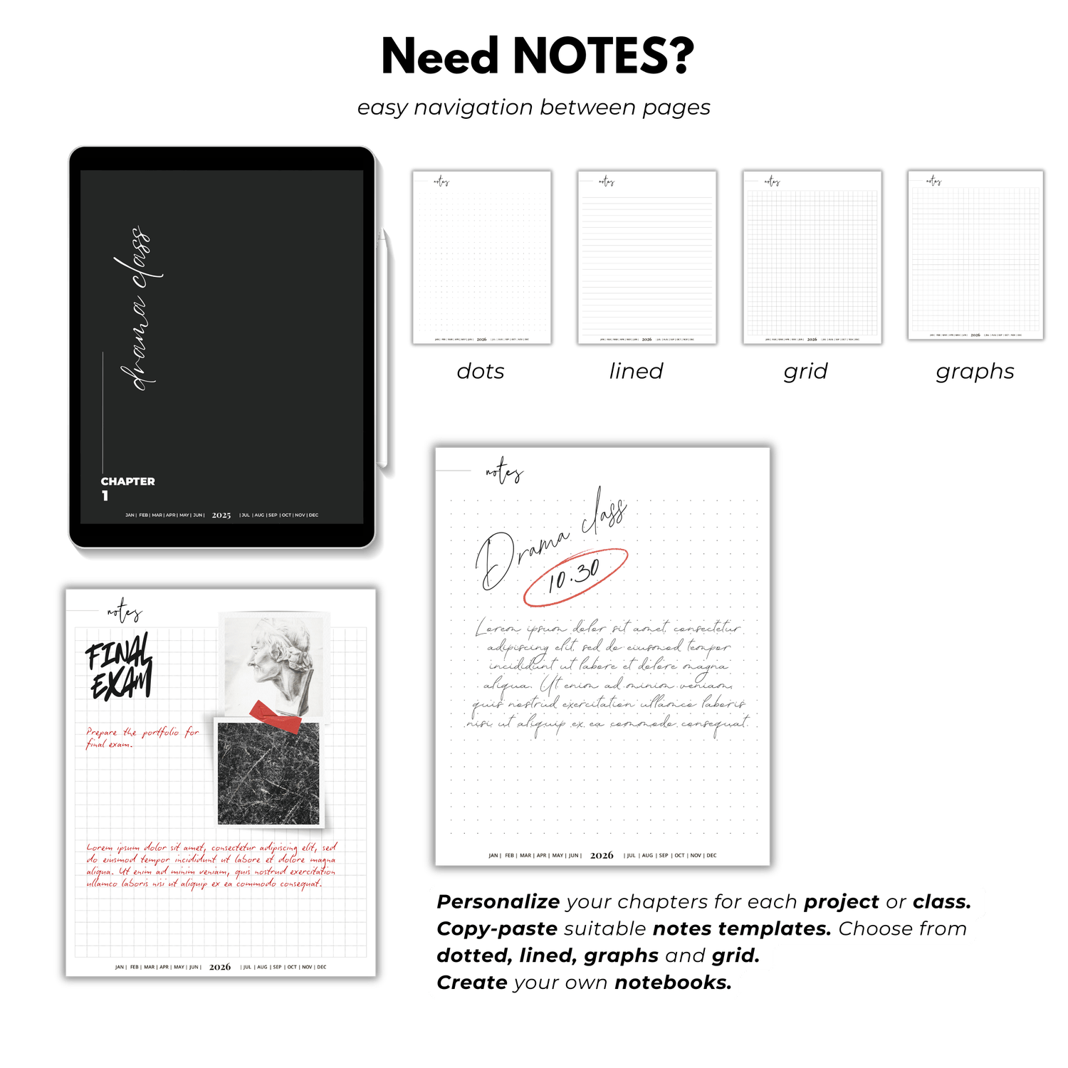 โ๏ธ Notes Pages: Choose from lined, dotted, grid, or graph layouts for ultimate versatility.