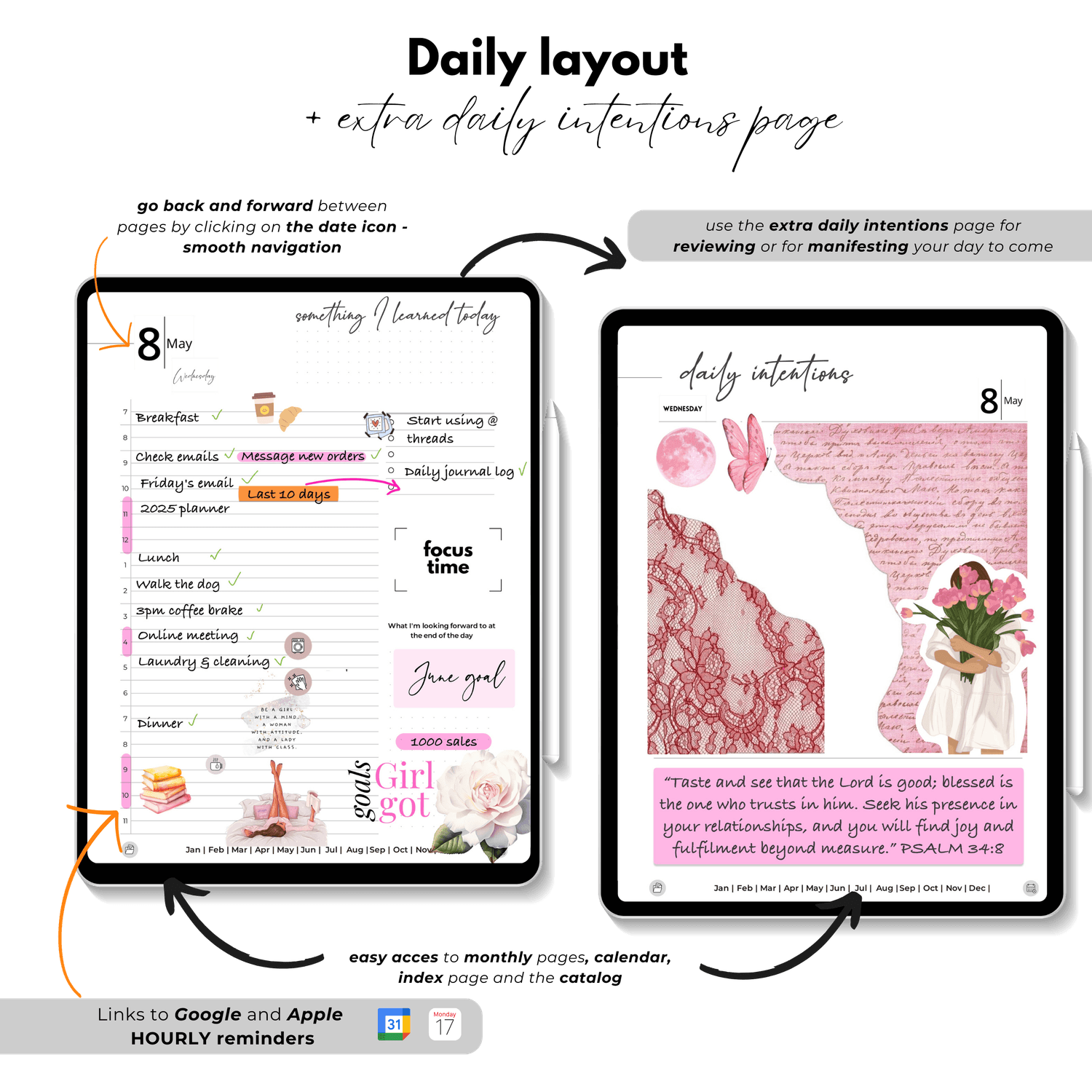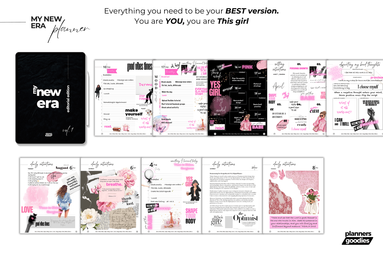 โข Yearly, monthly, weekly, and daily planner pages