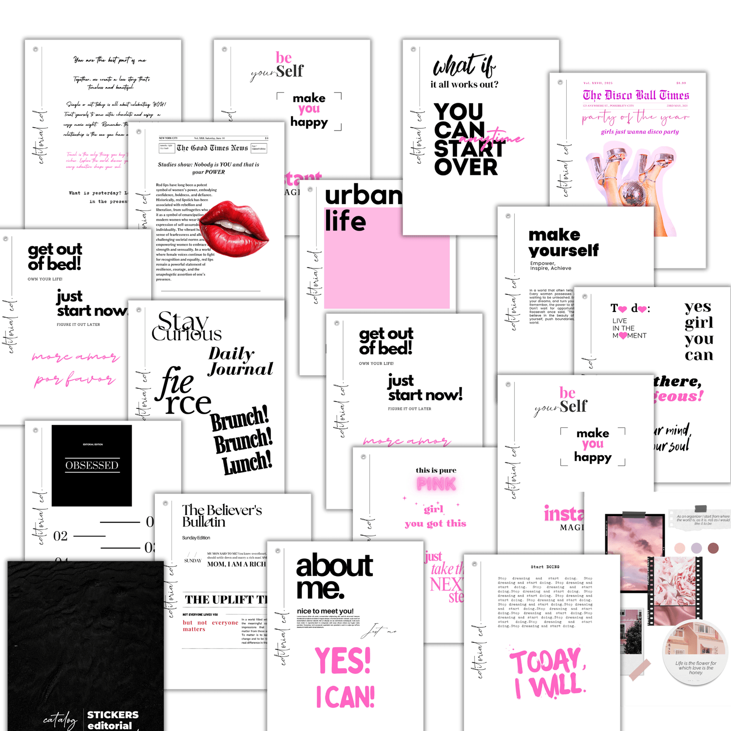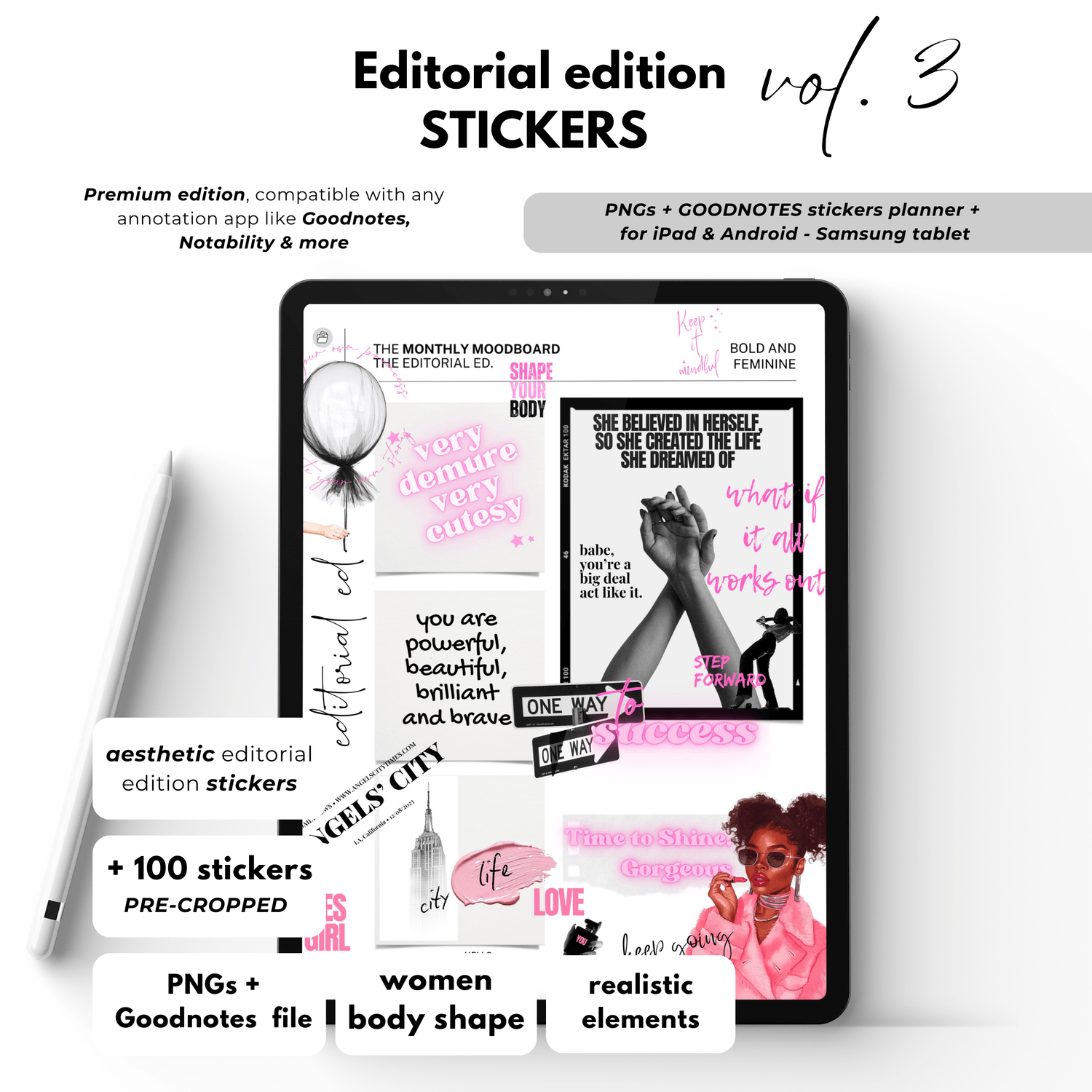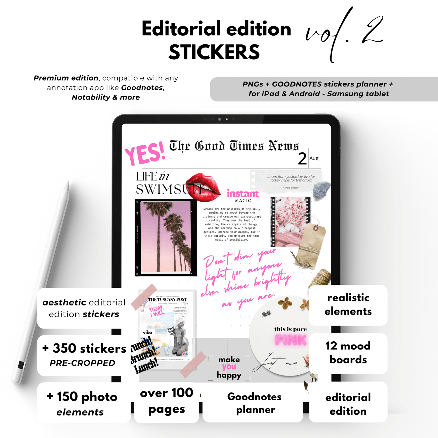 Premium Editorial Edition Digital Stickers for Goodnotes Planner with Girly Aesthetic, Fashion Magazine Editorial style, and Newspaper-inspired vibe + Mood Board Realistic Elements. Volume 2 contains: