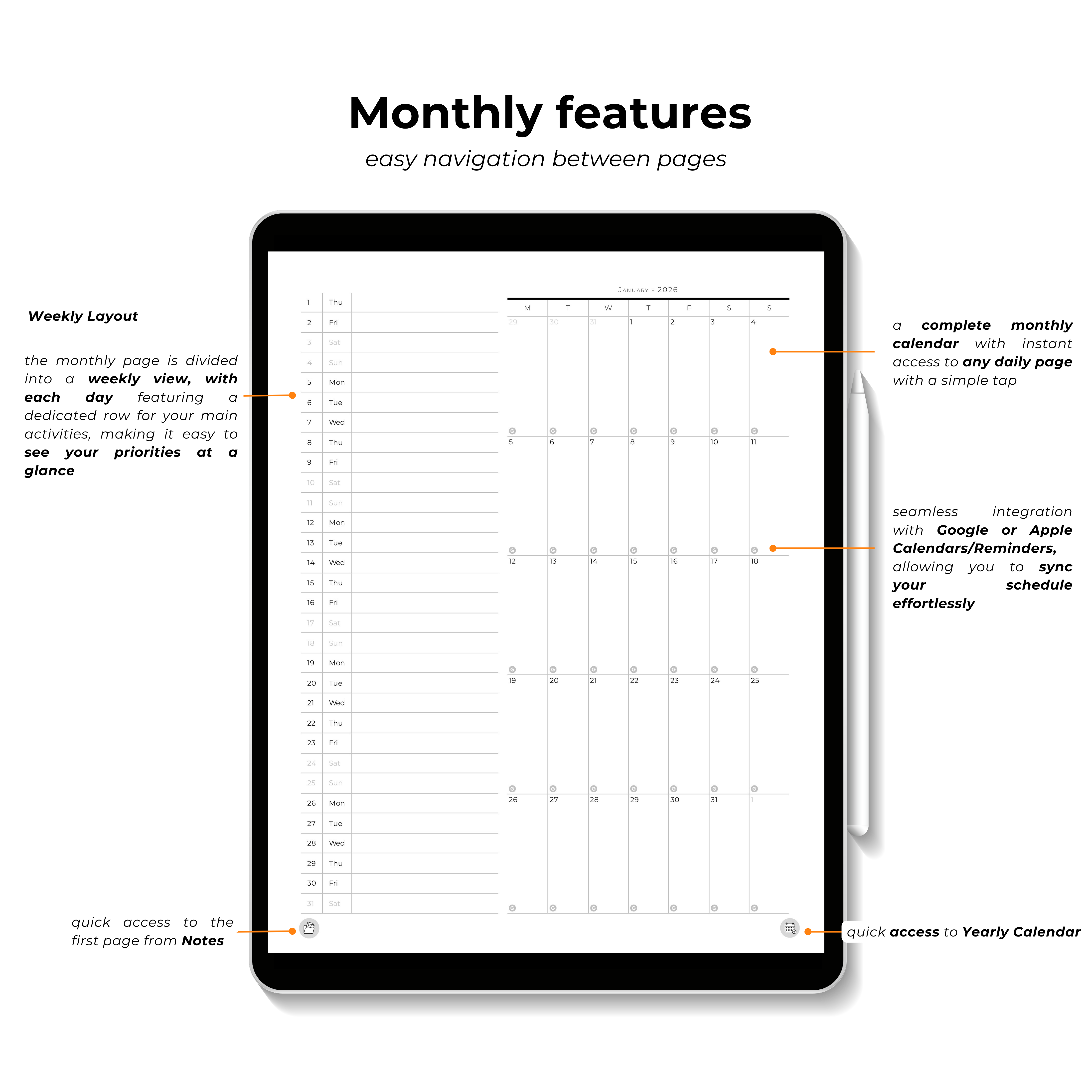 • Monthly calendar with instant access to any daily page with a simple tap
