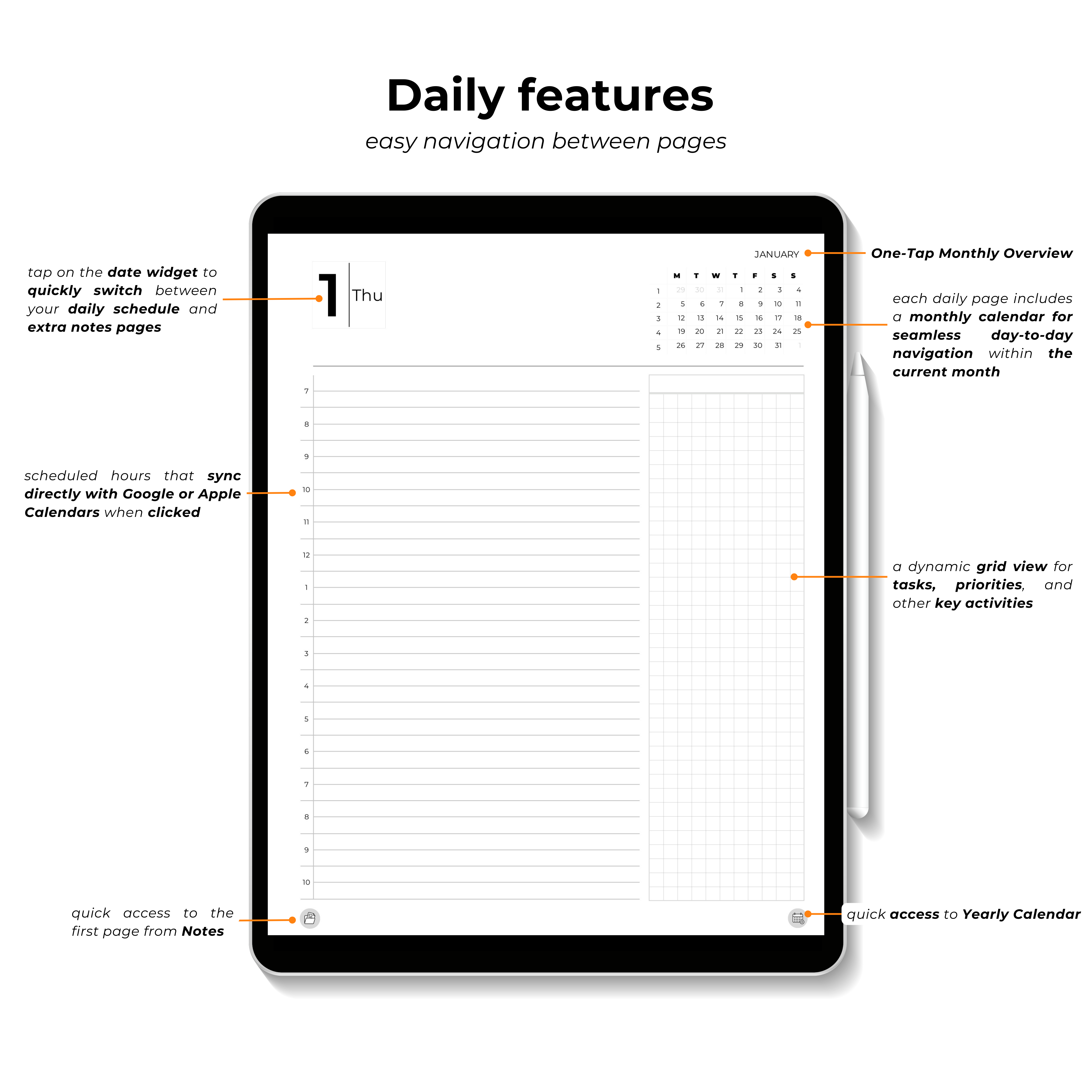 • Each daily page includes a monthly calendar for seamless day-to-day navigation within the current month