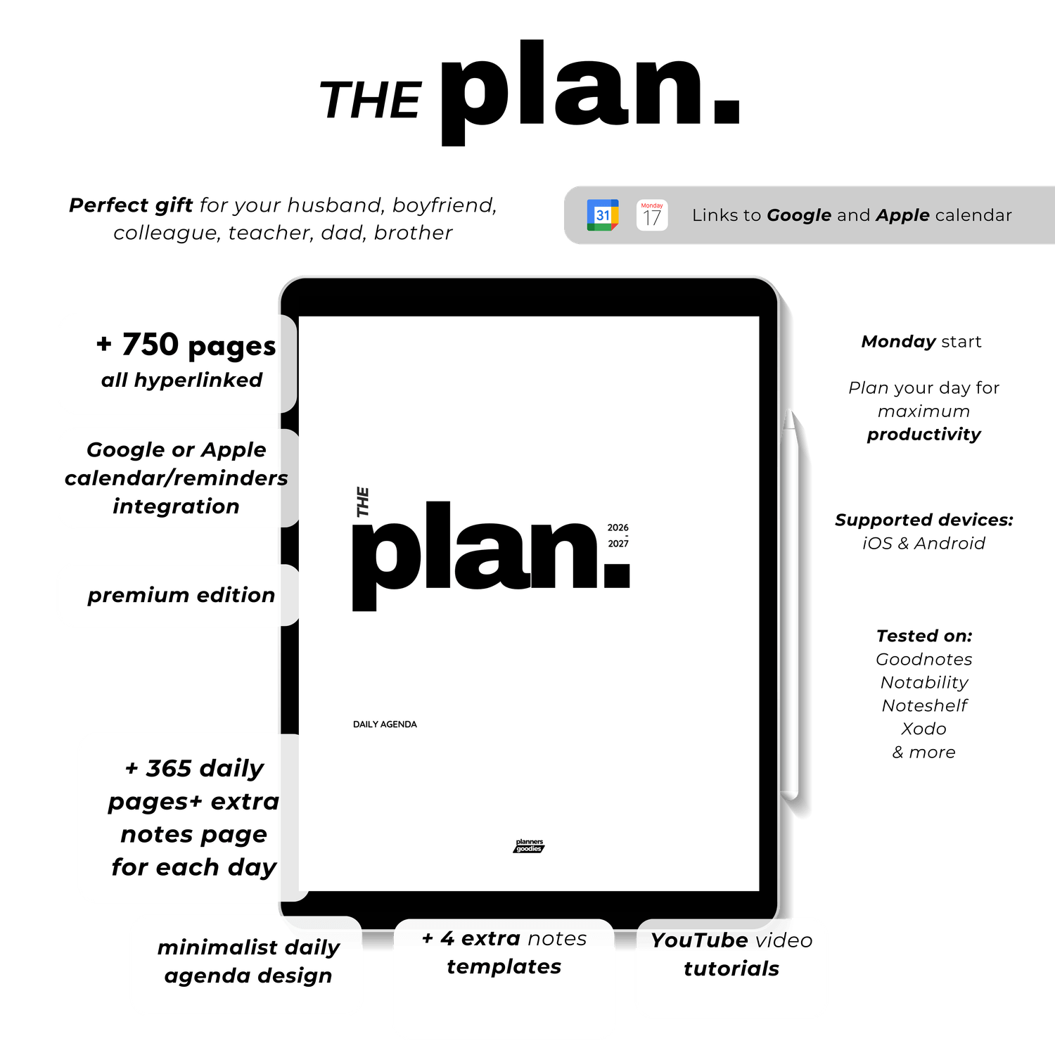 • +750 𝗵𝘆𝗽𝗲𝗿𝗹𝗶𝗻𝗸𝗲𝗱 and 𝐭𝐞𝐬𝐭𝐞𝐝 pages (my husband uses this daily minimalistic agenda every day)