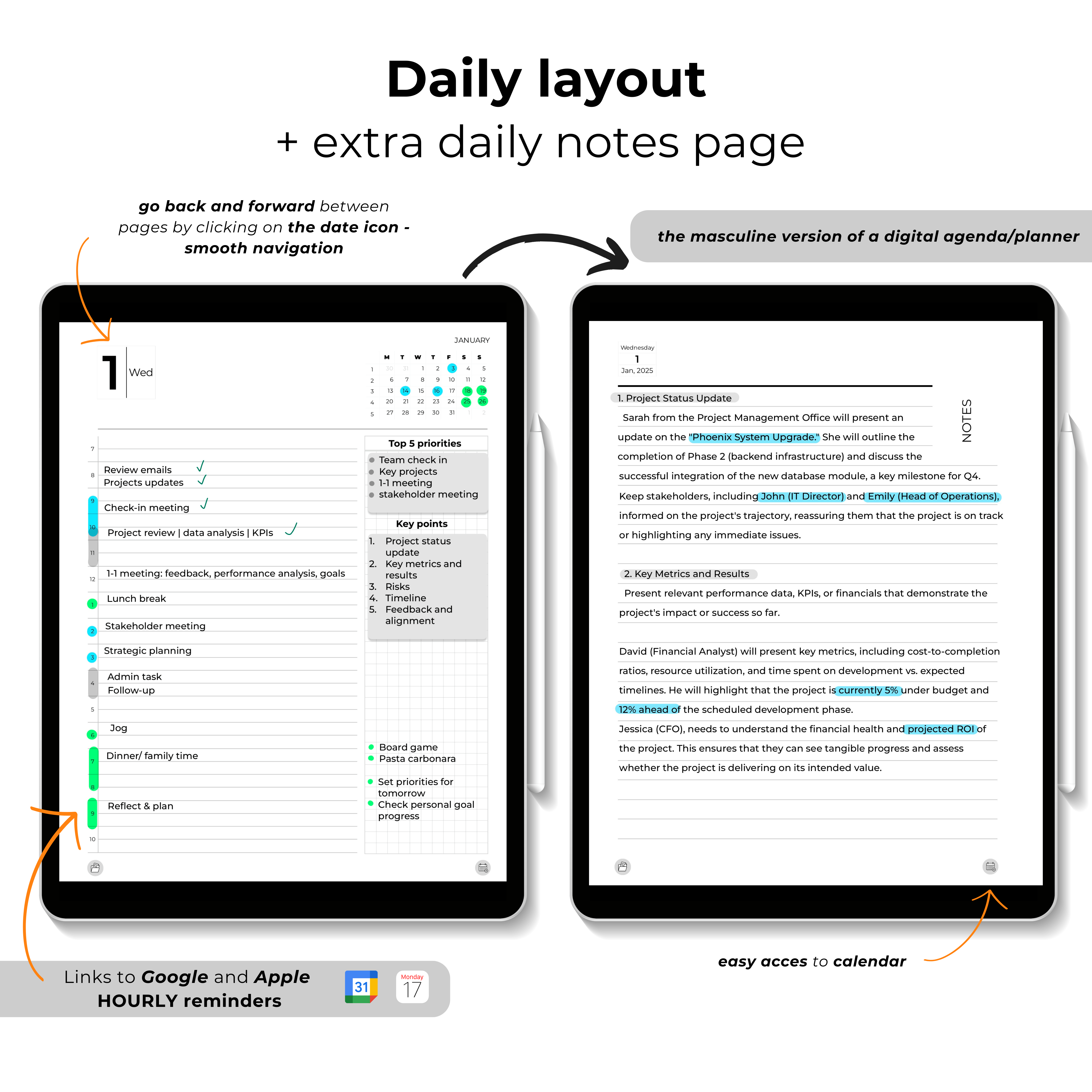 This hyperlinked PDF planner features seamless Google and Apple Calendar integration, with daily and hourly views, plus extra notes pages perfect for meetings and projects.
