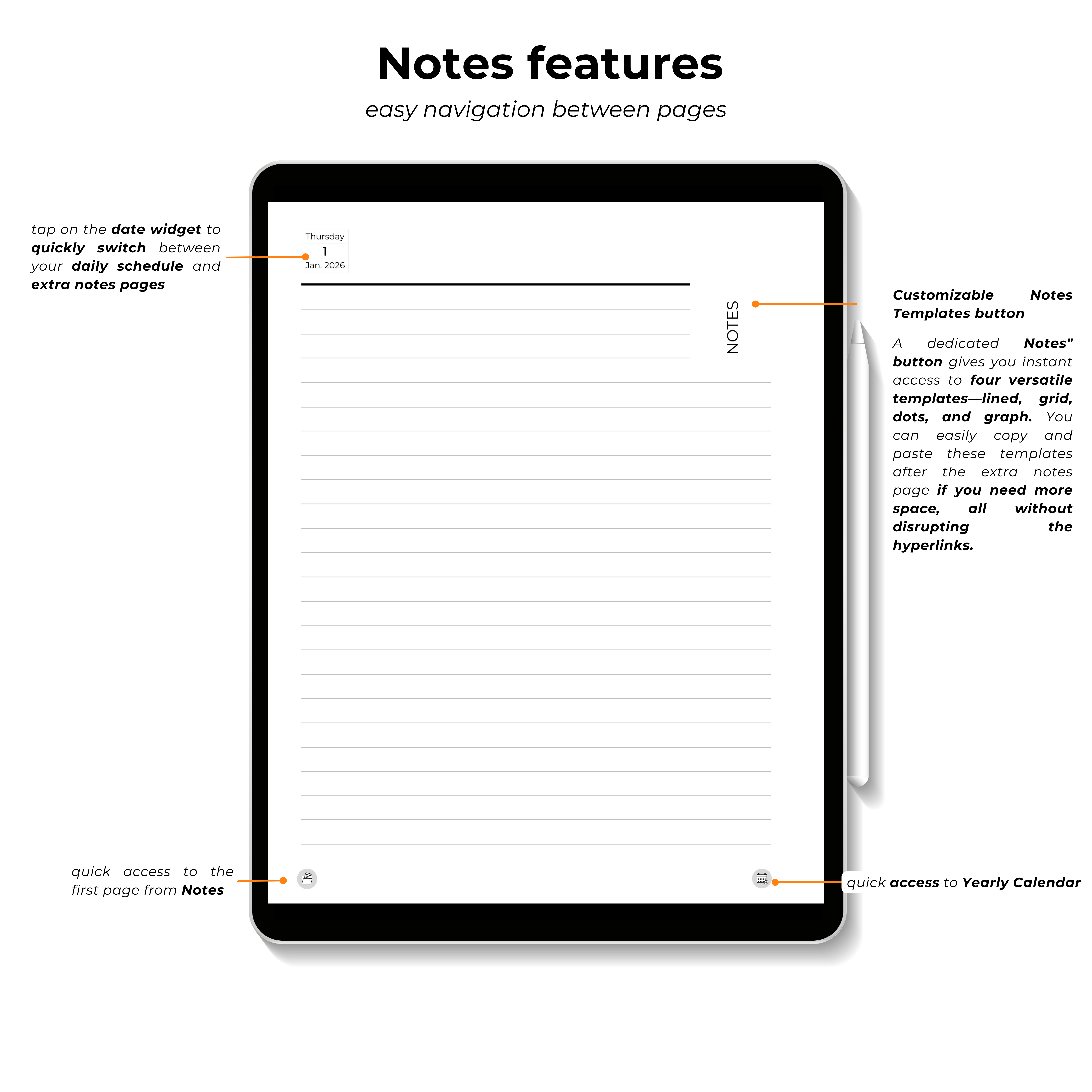 A dedicated Notes" button gives you instant access to four versatile templates—lined, grid, dots, and graph. You can easily copy and paste these templates after the extra notes page if you need more space, all without disrupting the hyperlinks.