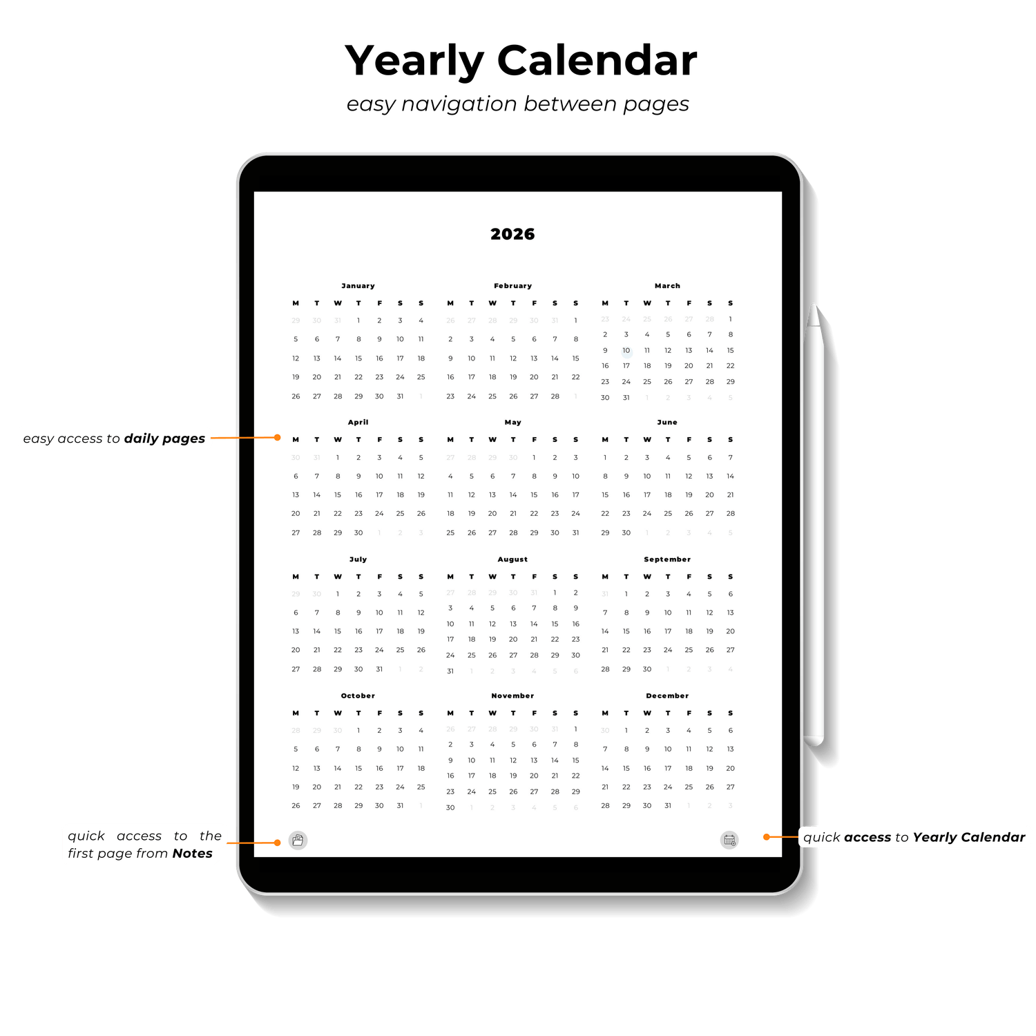 • Yearly Calendar page for easy navigation
